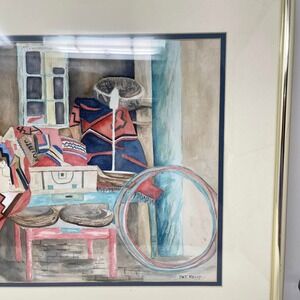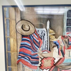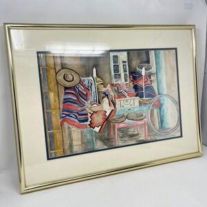 Vintage Framed Art Southwestern Navajo Blanket Scene Watercolor Painting Signed Pat Kelly
