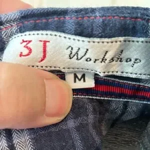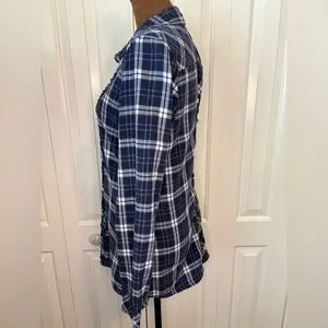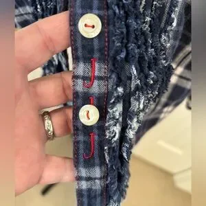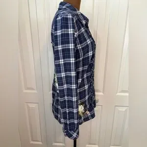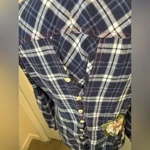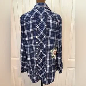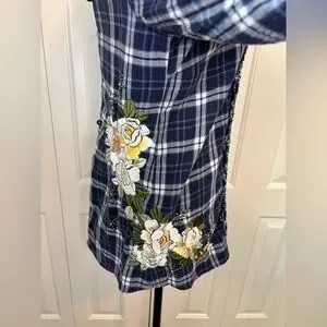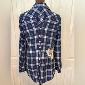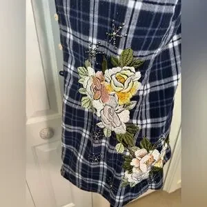 Stylish blue flannel with ruffled front and embroidered floral details on side and back from Johnny Was / 3J Workshop. Has button down back as well as the front. Shell buttons. Contrast Stitching. Perfect for casual outings.