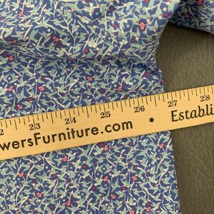 Color: Blue base with allover green vine, bird, and pink floral/berry print.