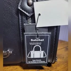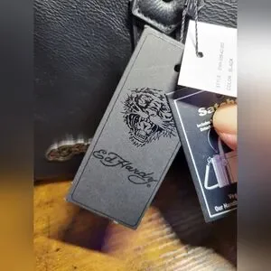 NWT Stylish Ed Hardy black vegan leather satchel bag with silver tone hardware. Featuring a sleek design with signature branding, this bag combines fashion and functionality. Comes with handles and an adjustable shoulder strap, has zipper closure and a zippered interior pocket.