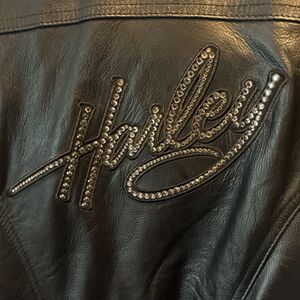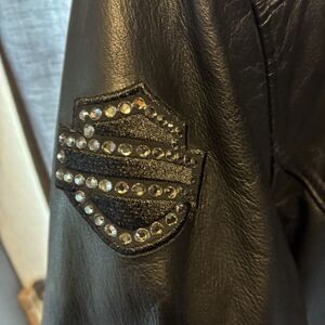 Harley Davidson Womens Medium Black Leather Rhinestone Jacket Moto Biker. In good used condition.
