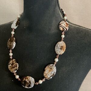 Jasper necklace. Handmade. Black, brown, white, gold. 25.5 inches long.