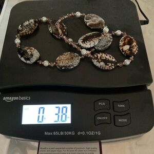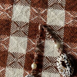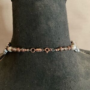 This stunning necklace features a blend of brown and cream beads, faux pearls and glass perfect for adding a touch of elegance to any outfit. Rose gold magnetic glass for easy on and off. Handmade.