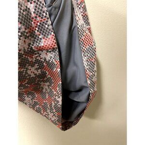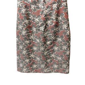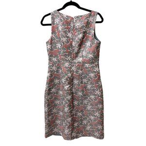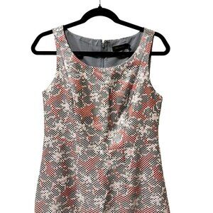 I purchased this in the early 2000s for a wedding and never wore it. The dress has a pretty shimmer metallic print in a geometric floral pattern. The color is light pink, grey, and cream. It's a midi length and fully lined. It can be dressed up for a wedding, cocktail party, or date night with some strappy heels, or paired with a cardigan to dress it down. Beautiful light shimmer with a mermaid feel.
