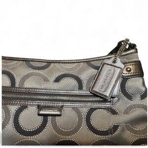 Classic Coach Signature “C” hobo bag in a sleek gray / pewter colorway with subtle shine. Timeless, versatile style that works for everyday wear and easily transitions from casual to polished.