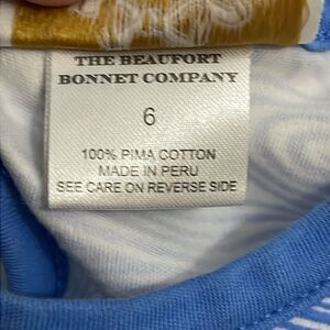 Blue, 100% pima cotton, sleeveless, play dress by The Beaufort Bonnet Company (TBBC), in a girl's size 6. Blue and white wave pattern and sea gull, bird print. Rear, keyhole button closure. Machine washable. Approximate measurements shown in photos. In great pre-owned condition.