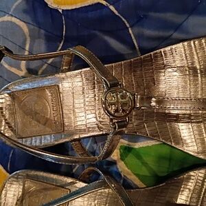 Tory Burch Silver/Pewter snake embossed leather 3 inch kitten heel sandals. Logo in center of strap. Good condition, size 8.