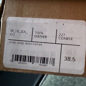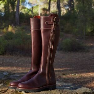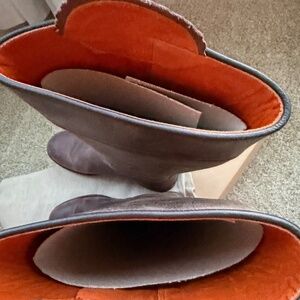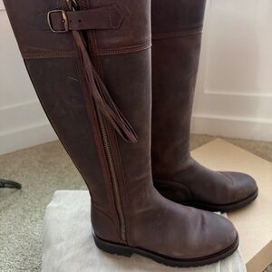 Penelope Chilvers Knee high tassel boots, size 38.5 in color conker ( dark brown), regular calf. These run big and fit more like an 8 or 8.5 to me. They are basically brand new with some damage to one boot. I had planned to return because they were too big, but my cat got a hold of a boot and scratched up part of the leather. See the last photo for the scuffing/scratches. The leather has a rugged look anyway so they’re definitely wearable, especially for that Doen or Ralph Lauren kind of look!
