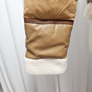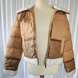 New with tags For All Mankind puffer jacket in a warm tan colorway with faux shearling trim and faux leather accents. Aviator-inspired design featuring a buckle collar, zip front, and cozy shearling hem and cuffs. Fully lined and insulated for warmth. Structured, stylish, and perfect for winter layering.