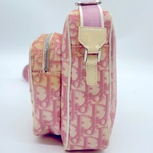 This elegant Dior crossbody bag showcases a stunning pink and cream monogram design, perfect for adding a touch of sophistication to your ensemble. Its compact, rectangular shape and adjustable strap offer both style and practicality for everyday use. The bag's classic monogram pattern embodies timeless elegance, making it a versatile accessory for any occasion.