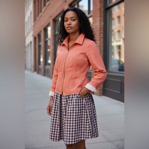 Stylish orange women's jacket w added peplum skirt. Features a comfortable fit and chic design