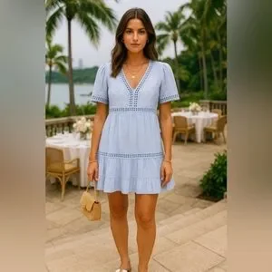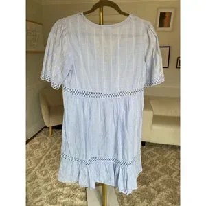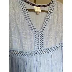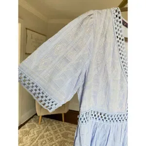This Knox Rose dress features a light blue checkered fabric with delicate embroidery and openwork detailing, creating a charming and vintage-inspired look. Its tiered design and puffed sleeves make it a breezy, comfortable choice for casual outings.