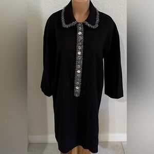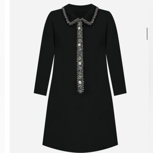 Chic black mini dress with elegant silver trim. Features a classic collar and button detail. Ideal for stylish outings.