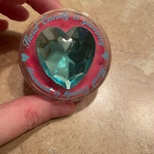 Round compact featuring a teal heart gem. Stylish and unique design! This is swatched collector’s discontinued 10 Years of Gloss Classic 2000’s make up! This has been stored away and ready for a new life! Swatched but still full of product, shimmery stand out pink that smells like heaven! This container also is one of a kind cute!