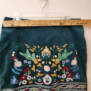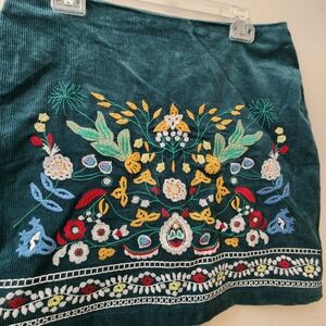 The Ladies XL Simplee Embroidered European Folk Art Mini Skirt in green with multicolor embroidery is a stylish and whimsical addition to any woman's wardrobe. Made from a comfortable cotton spandex blend with a corduroy fabric.