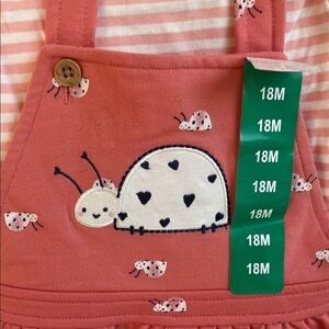 Adorable Pekkle kids matching set featuring a pink striped shirt and cute overalls with a ladybug design. Perfect for playful days. size 18 months