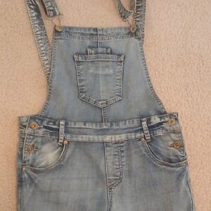 These blue denim overalls feature a trendy distressed look with a slim fit that tapers towards the ankles. The adjustable straps ensure a comfortable fit, making them perfect for casual outings. The soft, lived-in appearance adds to their appeal, offering both style and comfort.