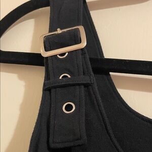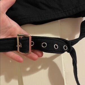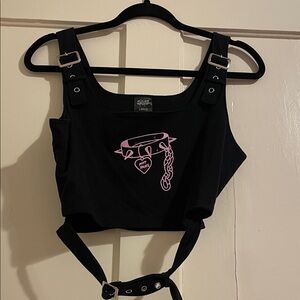 Stylish black crop top with pink graphic reading “not yours,” and featuring a spiked collar. Has buckles on the straps as well as on the bottom. Perfect for a grunge yet girly outfit!