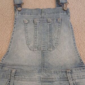 Stylish blue denim overalls by Wallflower. Features adjustable straps and front pockets.