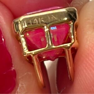 Bezel setting around the bright pink opal emerald cut stone
