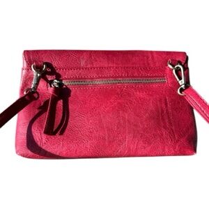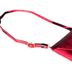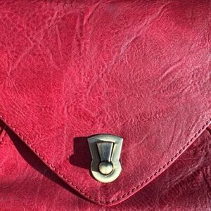 Sleek Joy Susan envelope bag in antiqued vegan leather with brass plated keyhole turnlock. Classic & simple design can compliment both casual and evening wear. Adjustable and removable strap allows versatility to wear crossbody or as a shoulder bag. Tie zip pull. Floral fabric lining. Inner compartment with one zip closure pocket and two open pockets. This bag has a rich red color, is soft and presents beautifully!