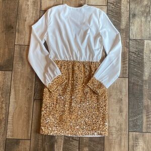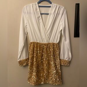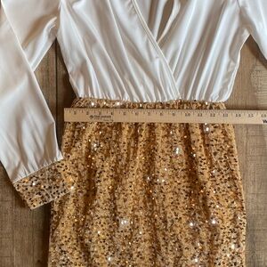 Elegant white dress with a gold sequin skirt. Perfect for parties.
