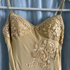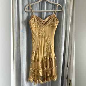 Absolutely gorgeous gold Y2K vintage cocktail mini dress with floral embroidery. Perfect for formal events, going out, stylish cocktail hours. Would be a great dress for a new year's celebration! Dress has adjustable straps and a padded chest for comfort. 100% silk with a luxurious feel and in perfect condition. From Sue Wong, size 6.