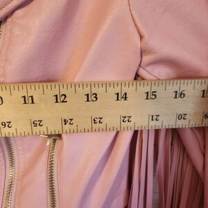 Chic pastel pink leather jacket with playful fringe. Adds flair to any look.