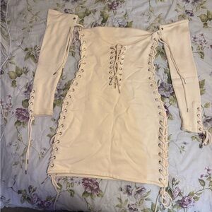 Elegant strapless dress in a chic cream color, featuring stylish lace-up details and detachable sleeves! Perfect for any occasion.