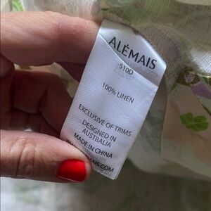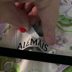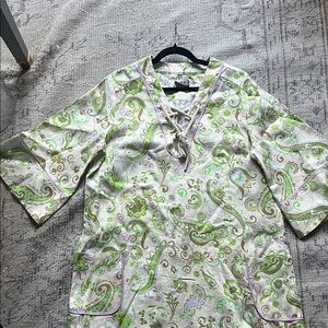Elegant paisley dress by Alemais. Features green and cream pattern. Perfect for casual outings. This looks like it’s never been worn. 100% linen… I’m not quite sure if it’s meant to be a relaxed cool house dress/summer party dress or a bathing suit cover-up but either way it’s gorgeous and looks brand-new. AG