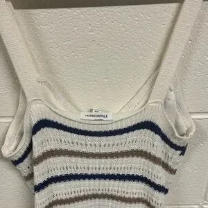 Chic midi dress with cream and blue stripes. Ideal for casual wear.