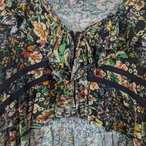 Free People Night Garden Combo Rudi Ruffle Long Sleeve Crop Top. A colorful array of florals brightens up this long sleeve cropped top. The combination of print and ruffles set apart this must-have by Free People. Button closure, v-neck, long blouson sleeves. 100% Cotton.