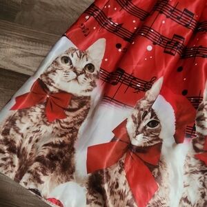 This charming Christmas dress featuring an adorable cat print. The dress combines a classic black top with a vibrant red skirt, perfect for any occasion.