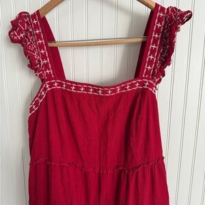Knox Rose red dress size L with tiered design. Features charming embroidery. Ideal for casual outings. In excellent condition.