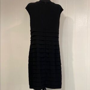 American Living black dress featuring elegant v-neck design with sophisticated tiered detailing throughout. Classic cap sleeves and knee-length silhouette perfect for versatile styling.