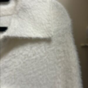Elegant cream teddy fuzzy jacket by Rachel Zoe. Features button closure and front pockets. Ideal for layering.