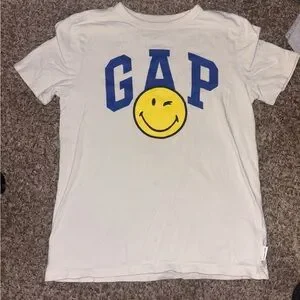 Fun GAP t-shirt with bold blue logo. Features a cheerful yellow smiley face. Soft and comfortable for everyday wear.