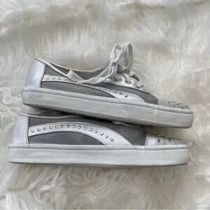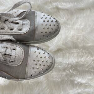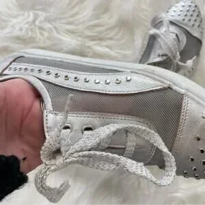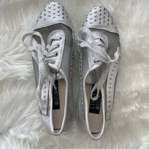 In excellent condition. Size 7. Silver metal studded. Lace-up sneakers. Flats. Shoes. Vintage. Metallic.