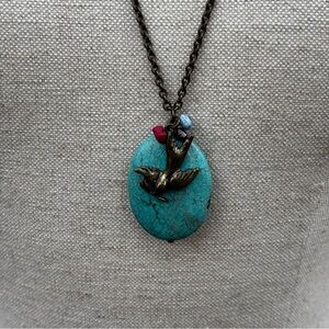 Turquoise pendant necklace with bronze bird charm multi-colored bead accents