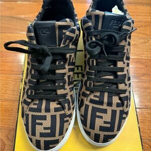 Stylish Fendi sneakers with bold black and brown pattern. Ideal for casual wear.