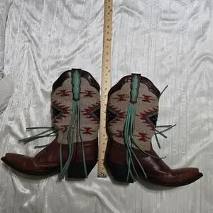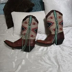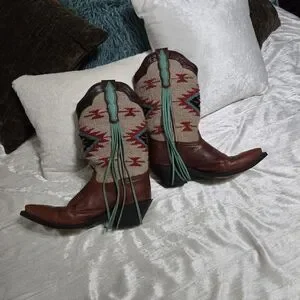Laredo Women's Bailey Western Boot with a snip toe, full-grain leather construction, a Southwestern-inspired blanket design shaft with turquoise fringe accents, a cushioned footbed, and a rubber outsole.