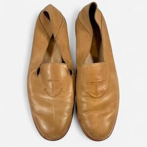 tan leather, slip-on loafers, nautical style, anchor detail, casual flats, boats shoes, smart casual, comfortable footwear, leather slip-ons, preppy style