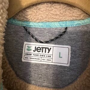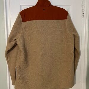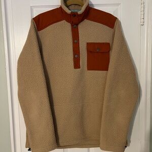 Like new and only worn a few times. This heavyweight tan/rust fleece pullover is warm, comfortable, and built for colder weather. Features include a button-up collar, chest pocket, side pockets, and an adjustable elastic drawstring hem. Perfect for everyday wear on cold days and nights. Comes from a smoke-free and pet-free home.