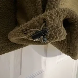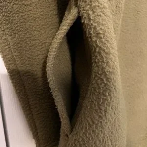 Like new and only worn a few times. This heavyweight olive and charcoal fleece pullover is warm, comfortable, and built for colder weather. Features include a button-up collar, chest pocket, side pockets, and an adjustable elastic drawstring hem. Perfect for everyday wear on cold days and nights. Comes from a smoke-free and pet-free home.