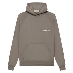 The Fear of God Essentials Hoodie Desert Taupe features an oversized fit, long sleeves, an attached hood, a rubber brand logo on the hood, and an "ESSENTIALS" graphic on the front and back.