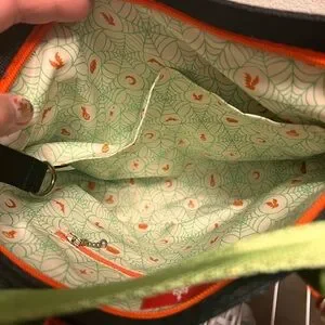 Spooky Halloween themed tote bag featuring cartoon characters. Comes with vibrant orange handles and a decorative keychain.