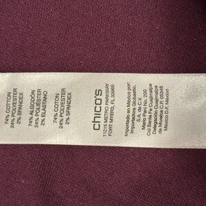 Chico's utility jacket in a deep burgundy (maybe considered purple) hue. Features gold button details. Ideal for a chic, casual look.