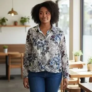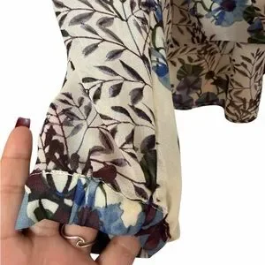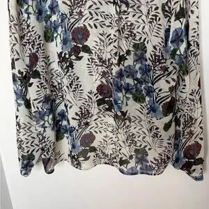 Beautiful Cabi floral blouse featuring an elegant botanical print in soft neutral tones with blue, burgundy, and green accents. This lightweight, flowy top is designed with a flattering relaxed fit, button-front neckline, and a high-low hem that provides extra coverage in the back while maintaining a polished silhouette in the front.
