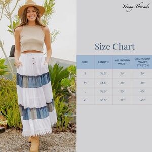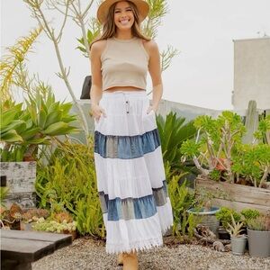 Elevate your style with this boho white and denim lined tiered maxi skirt. Perfect for any casual occasion.