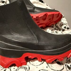 Stylish black leather boots with bold red soles. Perfect for winter weather.